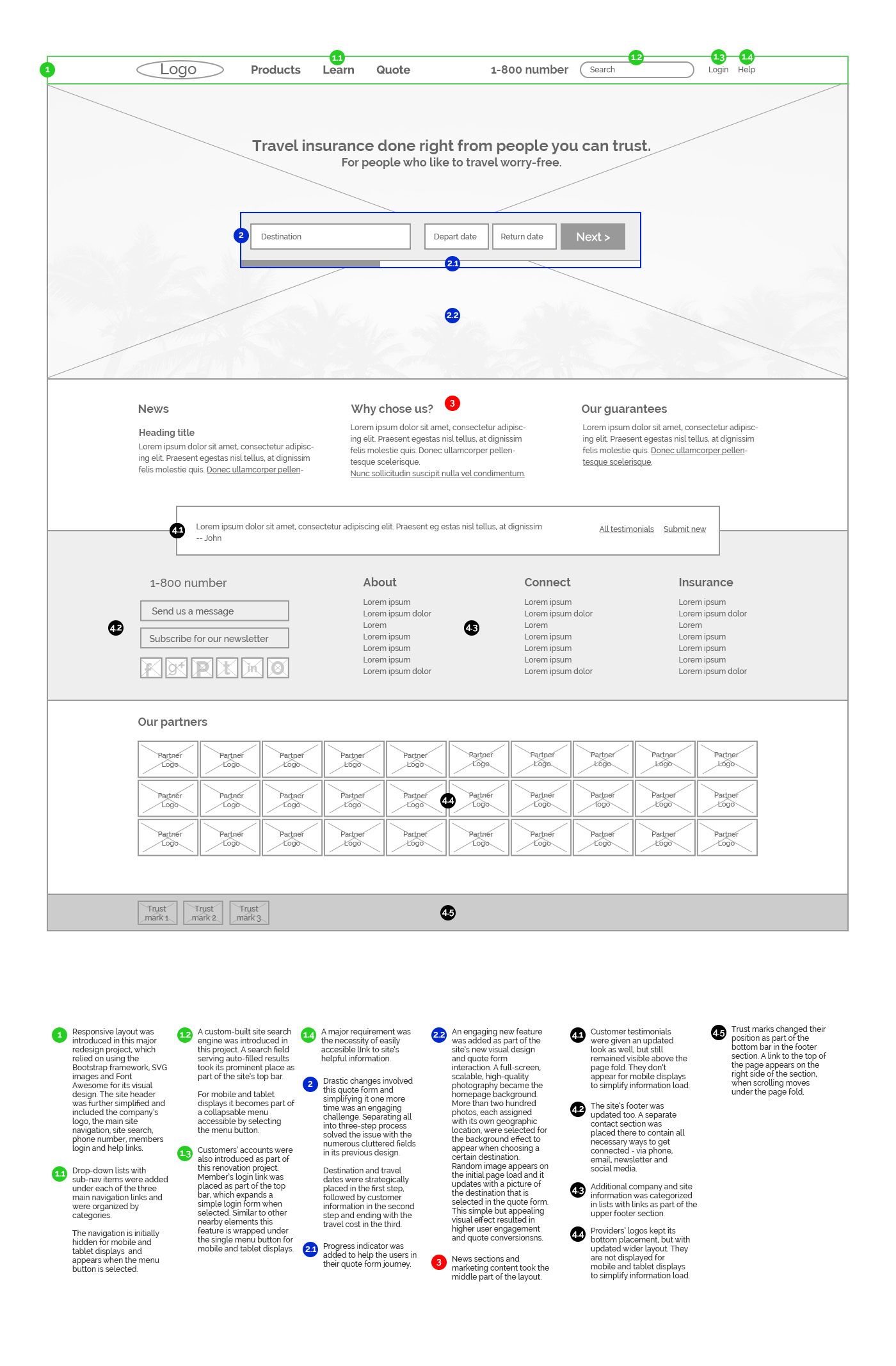 After years of mostly technical back-end upgrades, the homepage received a new look. A need for additional relative homepage content required the layout to be updated. The raising of quote conversions was another important challenge. Introducing a simplified quote form to the homepage was the key. It saved many extra steps previously causing serious user abandonment during the quote-buy process. It also helped shorten the order time and improving conversions. The navigation fit into a single row, which opened more space for content below. Introducing a supportive photo in the main content area balanced the focus on the quote form and surrounded main content.