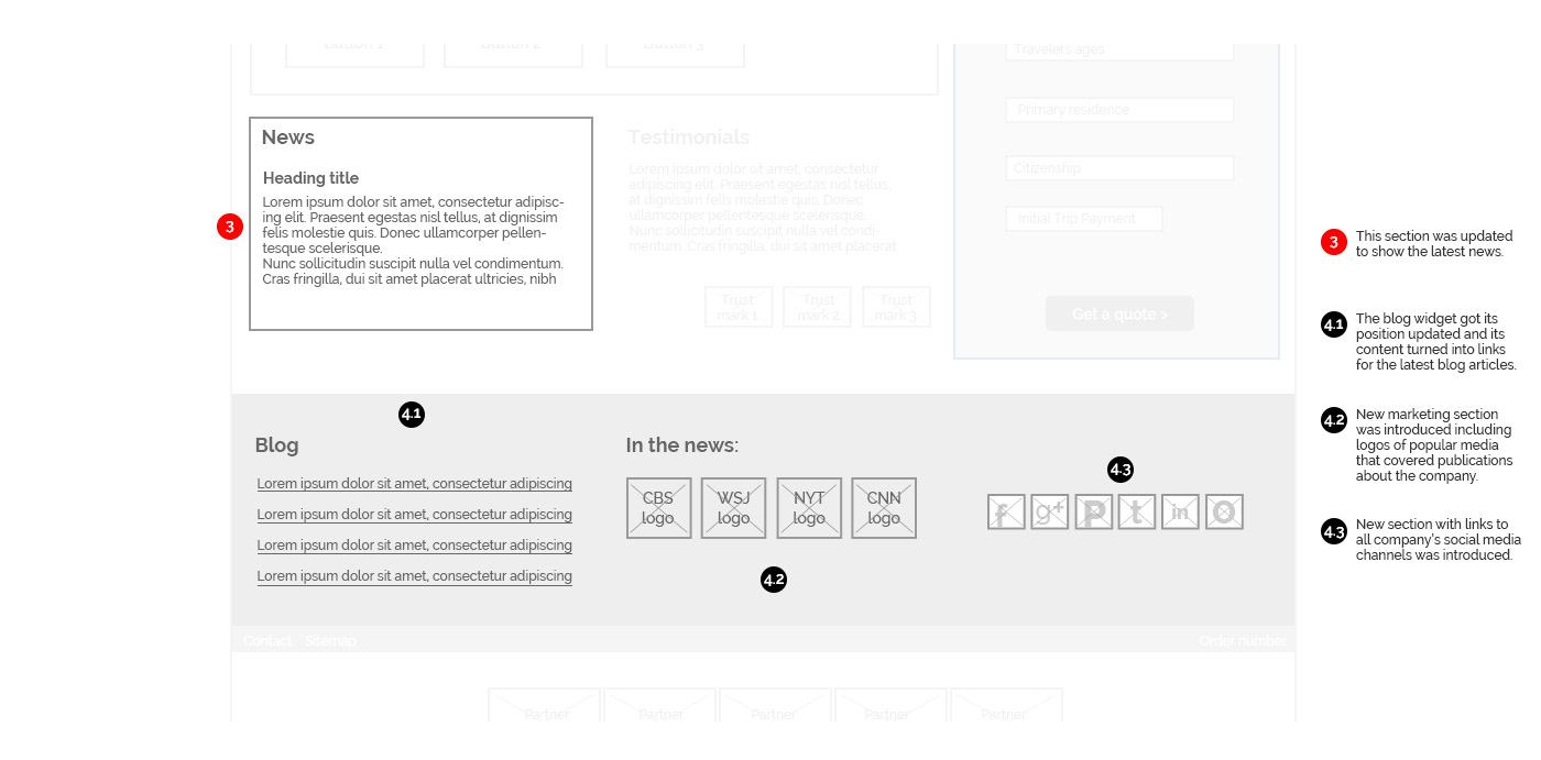 Improving organic SEO required rethinking of the homepage content strategy and updating the layout architecture to fit more relevant content. Main navigation was simplified down to three items, where each one became a tab with unique content and sub-navigation. Quote form didn't change but social media widgets were redesigned. Visual design was slightly updated as well.